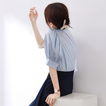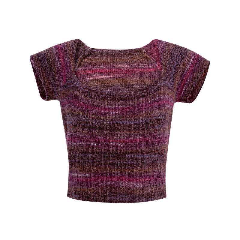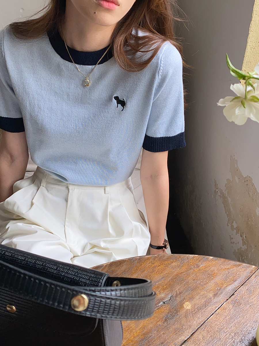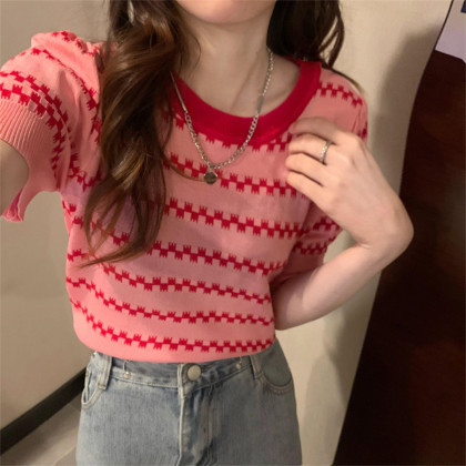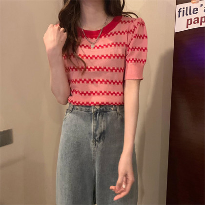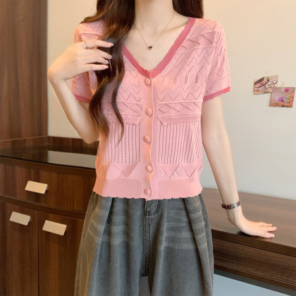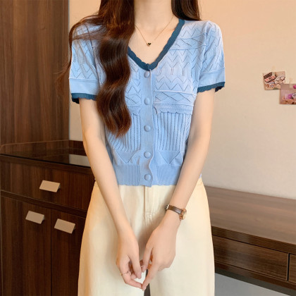 Leisure and sweet V-neck short sleeved knitted t-shirt for women