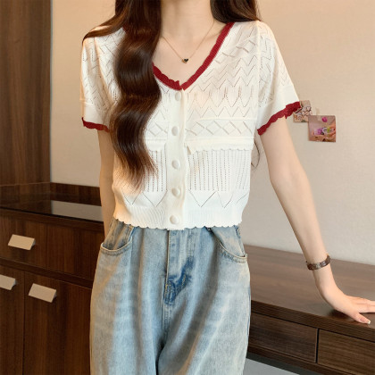Leisure and sweet V-neck short sleeved knitted t-shirt for women